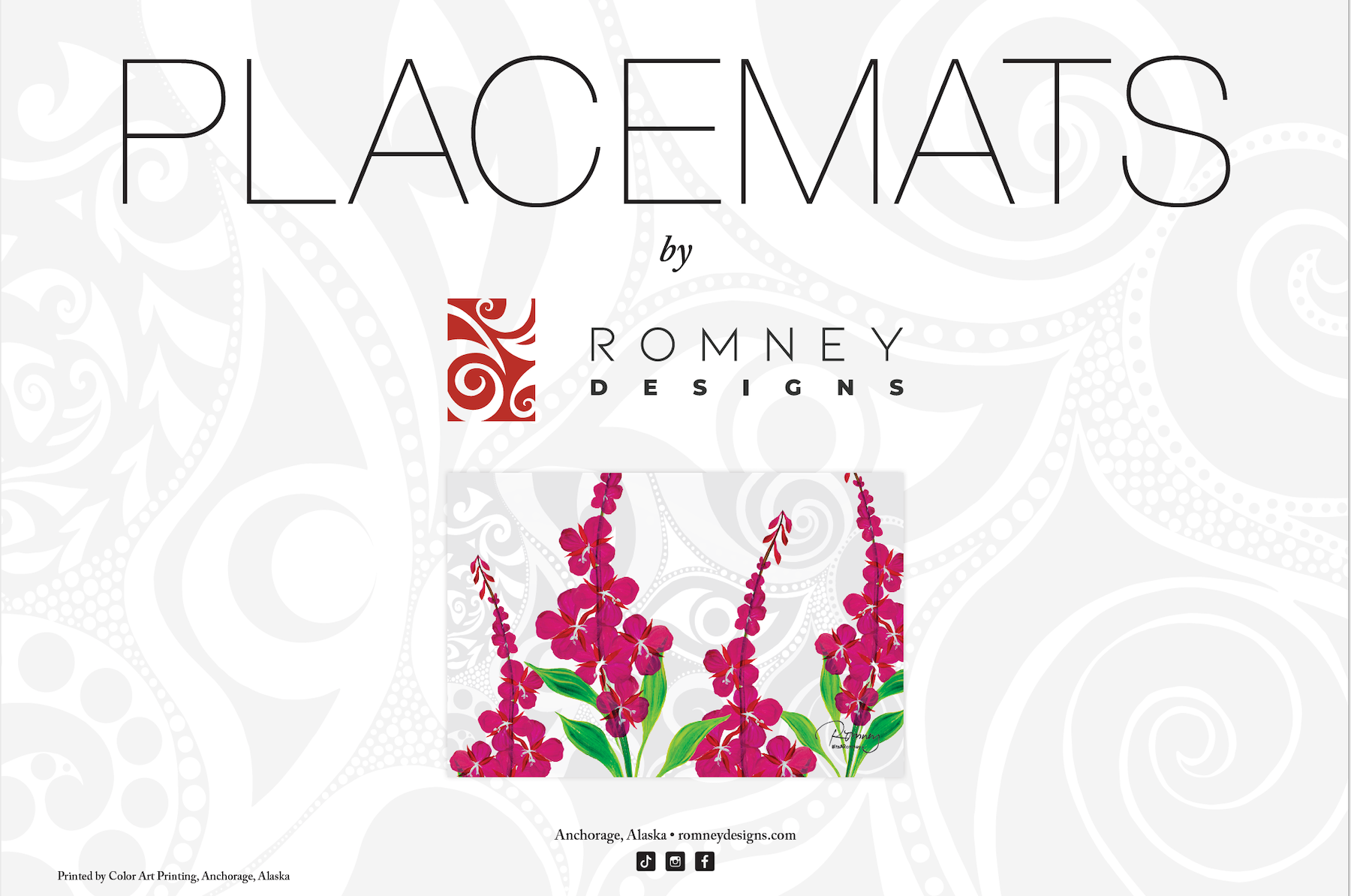This packet of 12 paper placemats printed with Romney's classic fireweed design will add a pop of color to your table.