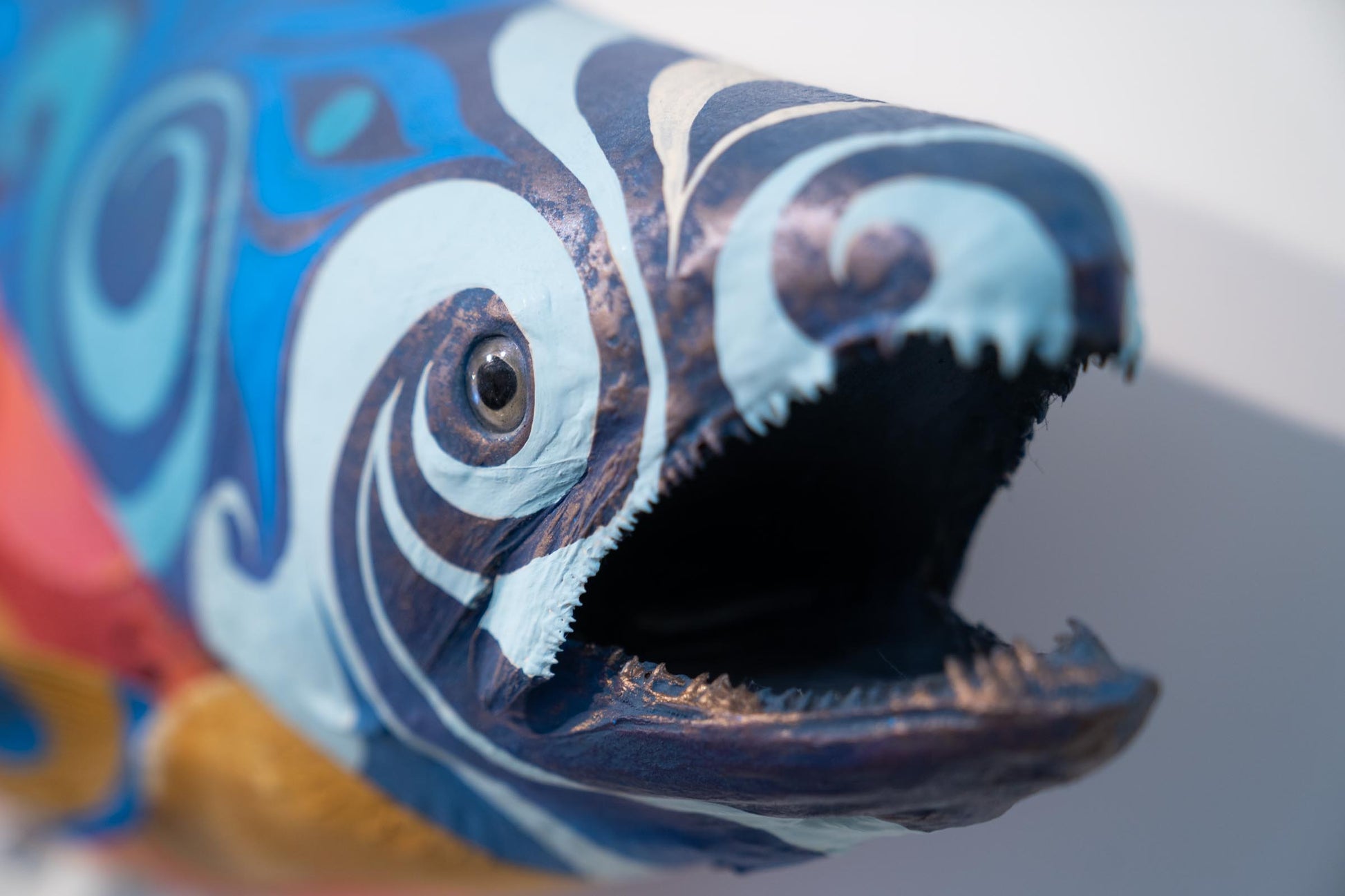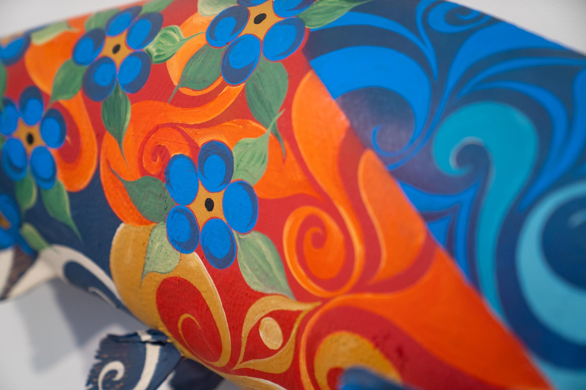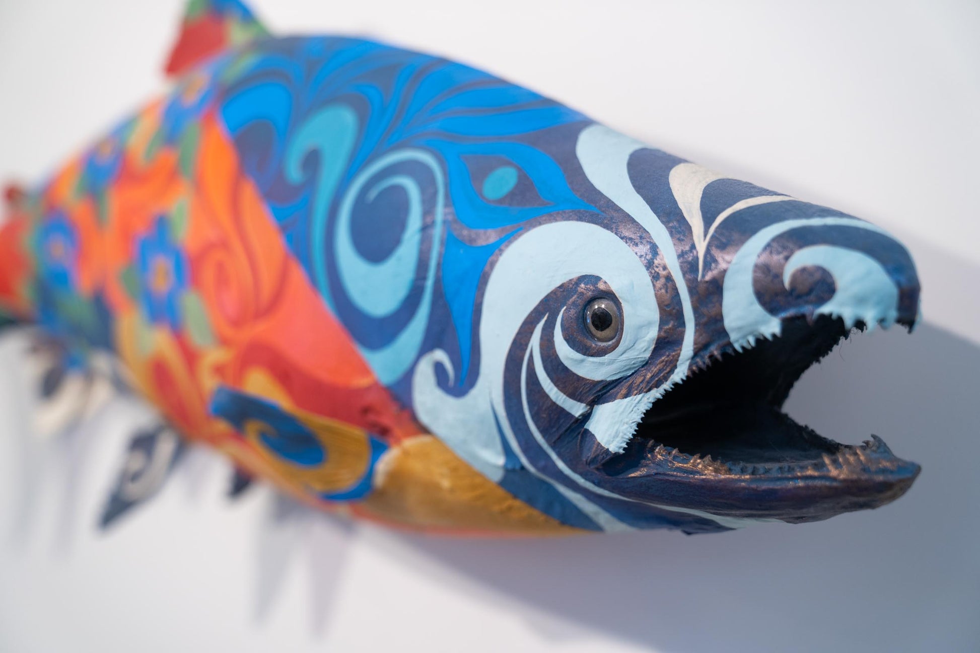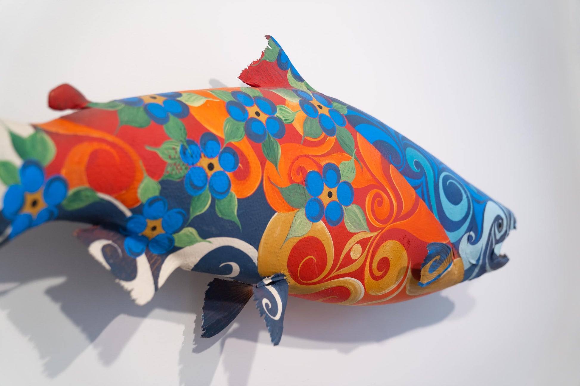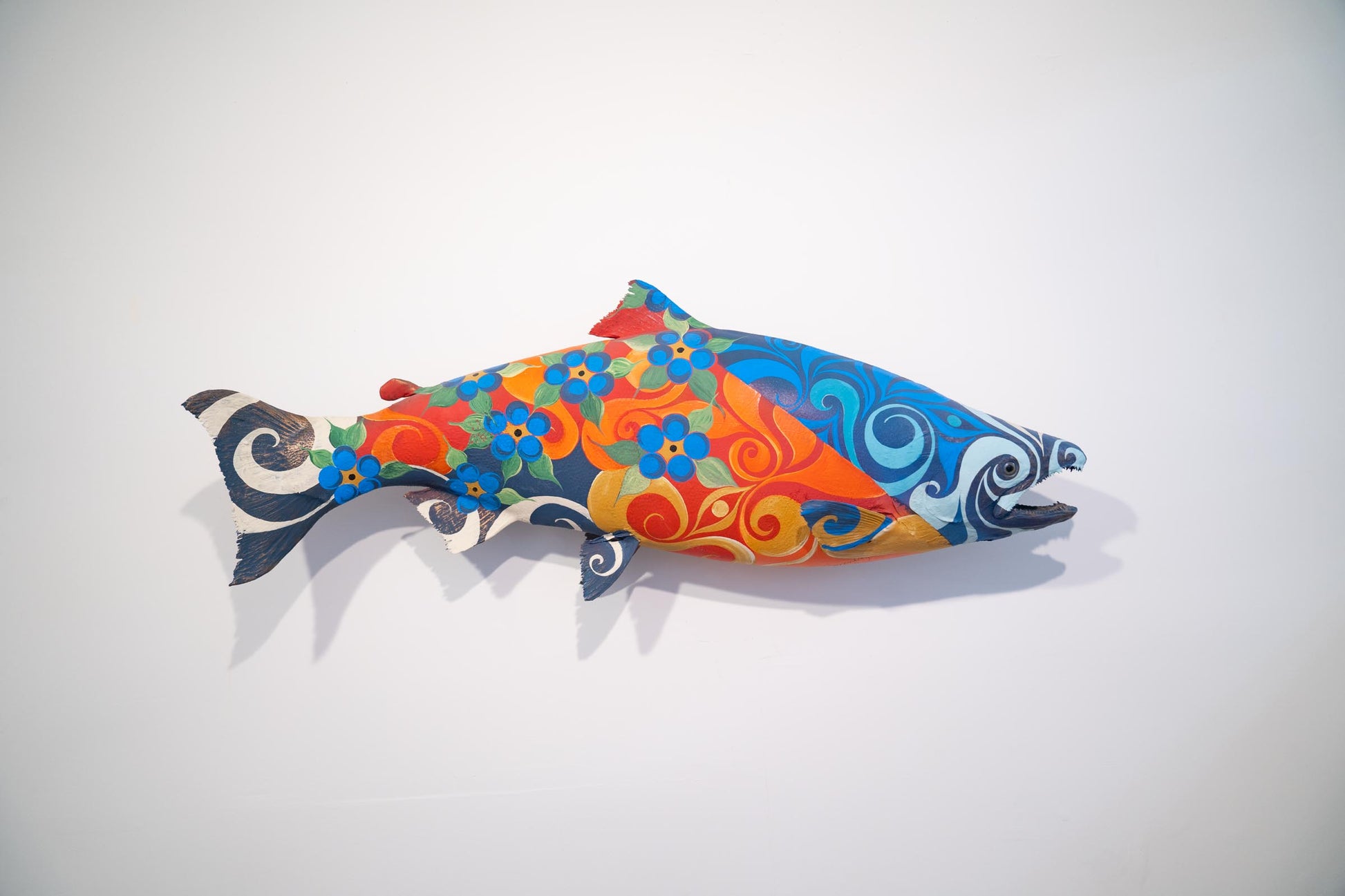 Queen Betty is an original skin-mount Alaskan King Salmon hand-painted in Romney's unique and recognizable style. Queen Betty is 43 inches long and has been given a new life as this colorful Forget-Me-Not adorned beauty.